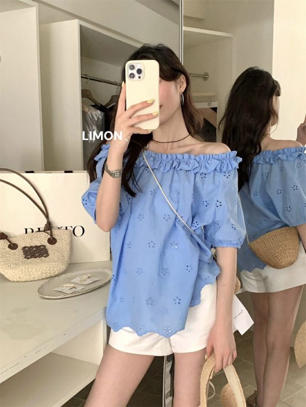 法式一字肩刺繡鏤空襯衫上衣-3色